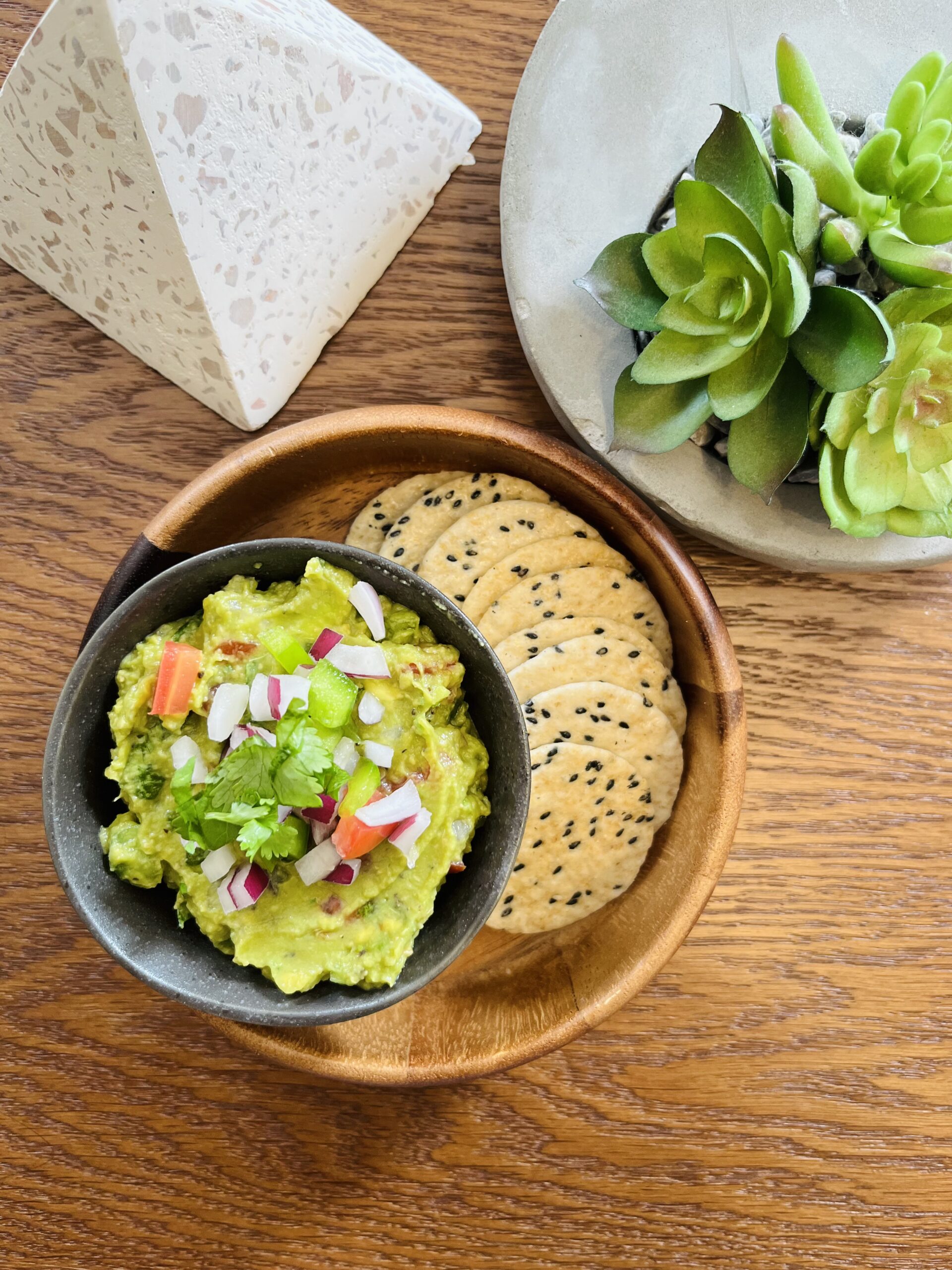 - Serve the guacamole with rice crackers, tortilla chips, vegetables or as a topping for sandwiches and tacos